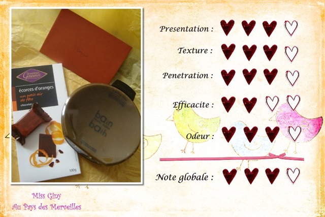 Ca sent divinement bon. Là contrairement au premier test Cream Team, j’ai été séduite par ce colis (tu m’étonnes, surtout quand il y a du choco dedans !!). La tablette de  chocolat est un délice, elle n’est pas écoeurante et me fait penser aux sarments du Médoc ! Le sucre se dissout bien dans l’eau du bain et laisse un délicat parfum praliné sur la peau. Quant au bain douche, on a l’impression de se tartiner de chocolat lorsqu’on l’applique sur la peau, c’est rigolo ! Ca sent très bon la praline et ça donne faim aussi !! Juste un mauvais point : l’odeur de chocolat ne reste pas longtemps sur le corps. Ca reste un délicieux moment gourmand sous la douche et dans le bain … Adopté ! :)