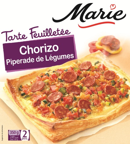 136400_B_232119 Après la tarte aux trois fromages et la tarte oignons & lardons, Marie innove en sortant  la tarte feuilletée chèvre lard & compotée d’oignons (une recette simple et généreuse aux saveurs sublimées par une touche légère de miel pour une association de saveurs délicates), la tarte feuilletée saumon & fondue de poireaux (une recette cuisinée avec de beaux morceaux de saumon, une fondue de poireaux onctueuse à la crème et une touche de « Savora » pour relever les saveurs) et la tarte feuilletée chorizo & piperade de légumes ( le chorizo, ingrédient dans l’air du temps, marie ses saveurs corsées à une compotée de légumes méditerranéens confits et cuisinés). Miam miam !