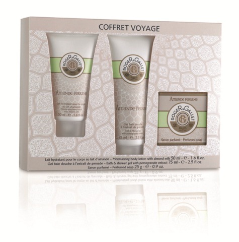 et enfin, Amande Persane, ma préférée, qui est proposée en coffret pour le voyage avec le Gel bain douche qui est enrichi à l’extrait de grenade reconnue pour sa richesse en sucre et en composés anti-oxydants, il nettoie en douceur et en respectant l‘équilibre naturel de la peau. Pour un confort optimal, un agent complexant les ions calcaires et de l’huile d’amande sont incorporés pour limiter le dessèchement