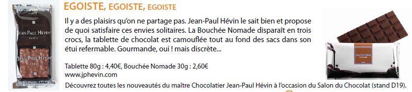 Cette jolie pochette qui sent divinement bon le chocolat sera en vente sur le salon au prix de 25€ (oui parce que la plaquette Hévin qui était dedans il y a belle lurette qu’elle n’est plus !!)