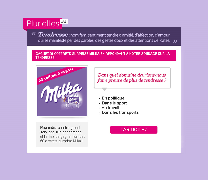 J’ai la possibilité de vous faire gagner ici deux boites gourmandes Milka supplémentaires ! Pour ce faire, vous participez au sondage sur Plurielles.fr et vous m’indiquez votre réponse à la 8ème question (à savoir en moyenne, combien de personnes prenez vous dans vos bras chaque semaine ?), et vous me donnez des précisions sur qui, où, quand, comment… Je veux tout savoir ! Je suis une grosse curieuse !! Les deux réponses qui me séduiront le plus remporteront les coffrets surprises ! Vous avez jusqu’à mercredi prochain, le 25 mai à 20h pour me donner vos réponses ! Résultats le lendemain !