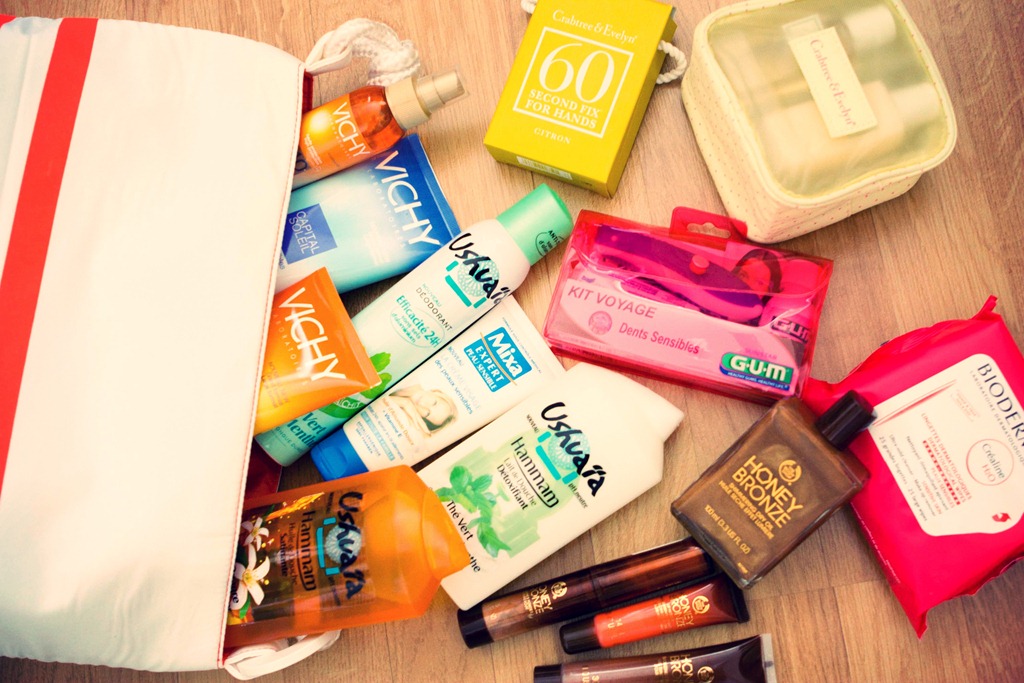 Après les livres, voici ma liste des essentiels beauté pour les vacances ! Vous pouvez le voir, j’ai de quoi faire hein ! Dans ma (maxi) trousse de toilette, nous avons :