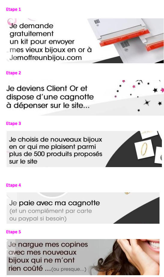 Bien emballés dans l’enveloppe fournie à cet effet, nos anciens bijoux en or sont repris sur jemoffreunbijou.com qui crédite alors notre compte client de la valeur poids-or de notre magot, sous forme de cagnotte. Ensuite il ne reste qu’à choisir le bijou désiré parmi les 500 références actuellement présentes sur le site puis régler avec sa cagnotte ! Facile !